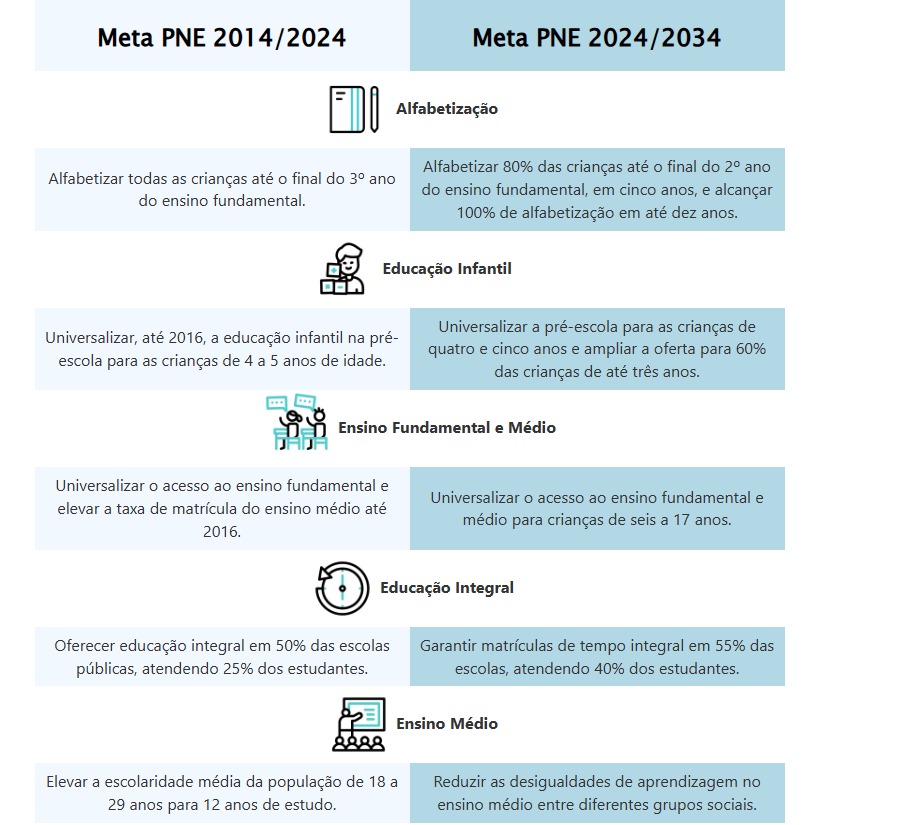 A proposta do novo PNE foi elaborada pelo Ministério da Educação a partir das contribuições de um grupo de trabalho, da sociedade, do Congresso Nacional, de estados, municípios e conselhos de educação. Conforme dados da Agência Senado, o texto também inclui sugestões da Conferência Nacional de Educação, realizada em janeiro de 2024. Para cada objetivo previsto no plano, foram estabelecidas metas que permitem seu monitoramento ao longo do decênio. São 58 metas, comparáveis com os 56 indicadores do PNE 2014-2024 (que foi prorrogado até dezembro de 2025).