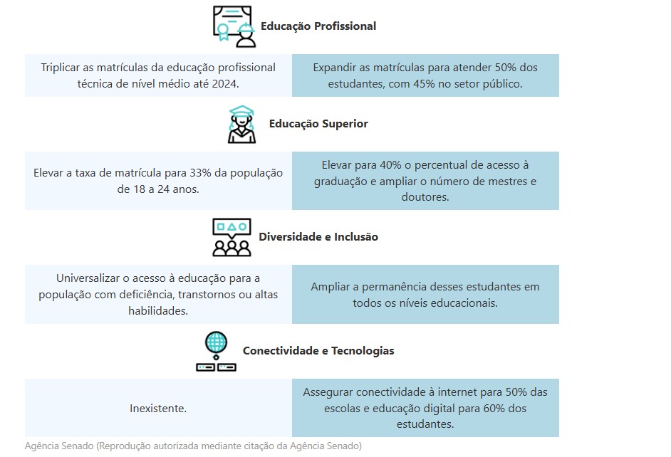 O Plano Nacional de Educação está em debate no Congresso Nacional por meio do Projeto de Lei nº 2.614/2024, de autoria do Poder Executivo. O PNE tem 18 objetivos, 58 metas e 253 estratégias que União, Estados e Municípios devem cumprir na Educação Básica, desde a Educação Infantil até os ensinos Fundamental e Médio. O plano também aborda a educação profissional e tecnológica e no ensino superior.