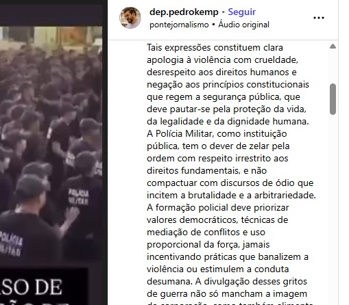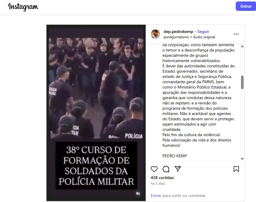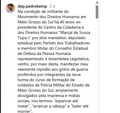 O deputado estadual Pedro Kemp (PT), após fazer um post no Instagram, no @dep.pedrokemp https://www.instagram.com/reel/DM1dqggNPgt/?igsh=czYzNHgxajViYnB3, em repúdio ao vídeo polêmico que mostra, no curso da Polícia Militar, os PMs em gritos de guerra de apologia à violência, também se manifestou publicamente na sessão ordinária nesta terça-feira (5), da Assembleia Legislativa de Mato Grosso do Sul. O parlamentar apresentou uma indicação ao Governo do Estado e pediu apuração imediata e explicação sobre o fato. “Um absurdo o que aconteceu. O vídeo revela que está havendo um desvio na formação dos policiais militares do nosso Estado”.