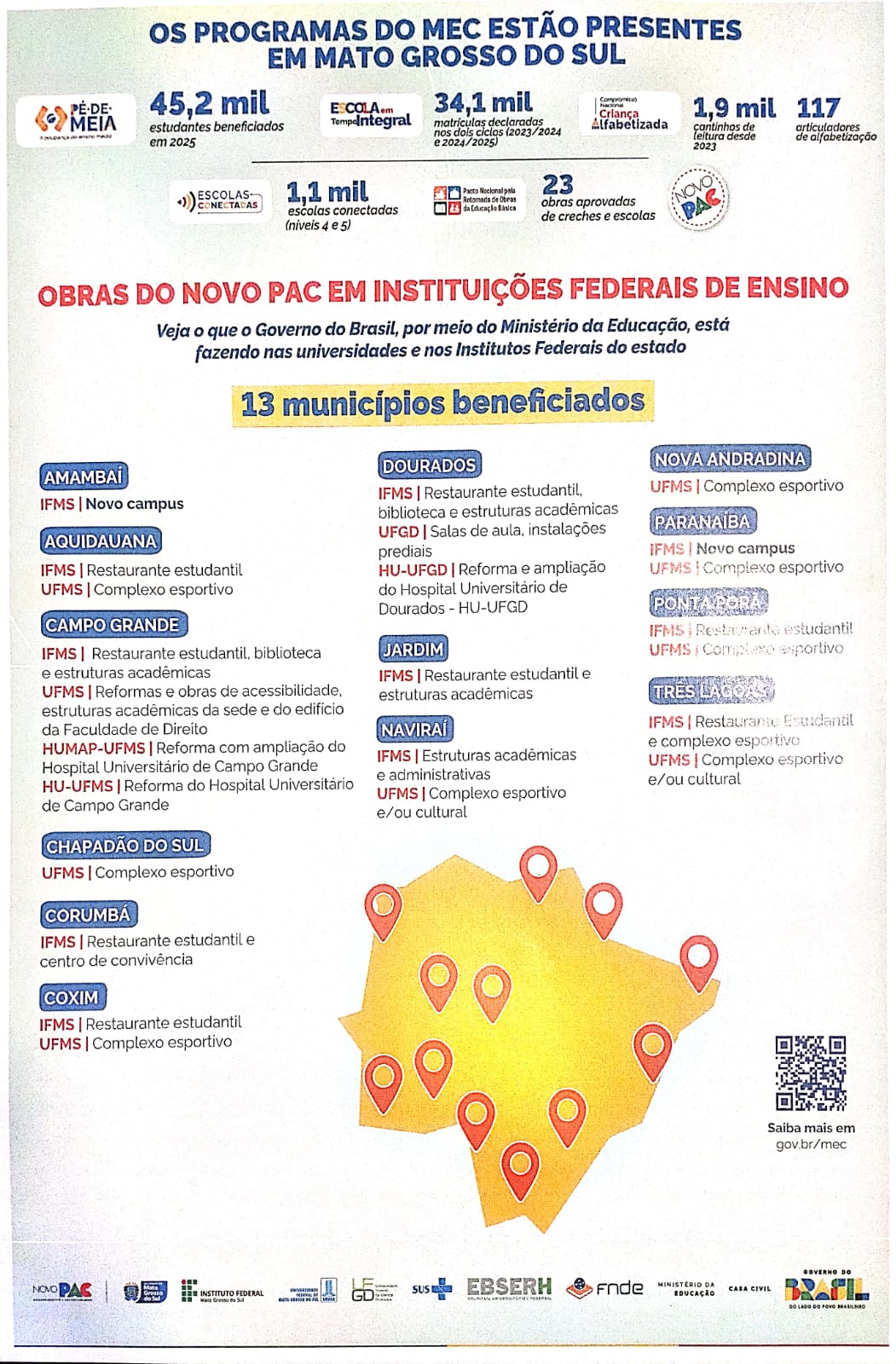 Para os campi do Instituto Federal, o repasse total será de R$ 87,8 milhões, sendo R$ 37,8 milhões para consolidação e melhoria da infraestrutura dos campi existentes do Instituto Federal de Mato Grosso do Sul (IFMS), nos municípios Aquidauana, Campo Grande, Corumbá, Coxim, Dourados, Jardim, Naviraí, Ponta Porã e Três Lagoas. Desse montante, já foram destinados 12,9 milhões. Outros R$ 50 milhões estão sendo destinados para a expansão do IFMS, com a construção de dois novos campi, nos municípios de Amambaí e Paranaíba.
